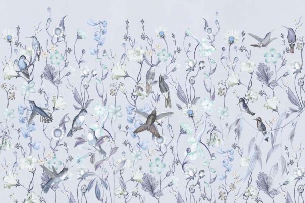 Een levendig ontwerp met delicate bloemen en sierlijke kolibries, harmonieus verweven in een luchtige compositie. Dit patroon ademt een verfijnde natuurlijke charme en brengt een frisse, lenteachtige sfeer in elke ruimte.