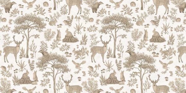 A magical forest pattern with detailed animals such as deer, rabbits, badgers, and owls, framed by trees, bushes, and mushrooms. The vintage background color creates a fairy-tale, serene atmosphere, ideal for adding an enchanting accent to any space.