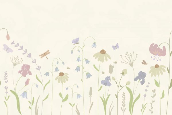 High flower field with different flowers and various insects like butterflies and bees. Colour: Beige with various colours like old pink, green and lilac
