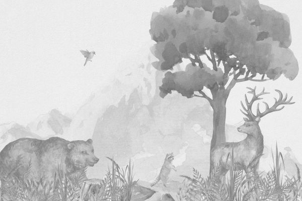 A deer, a bear and a raccoon are standing in front of a big mountain in the background. This cute photo with soft grey shades is perfect for the children's or baby's room.