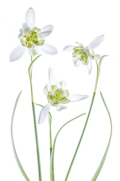 Three white flowers on a white background. Galanthus Flore Pleno was created by Mandy Disher.