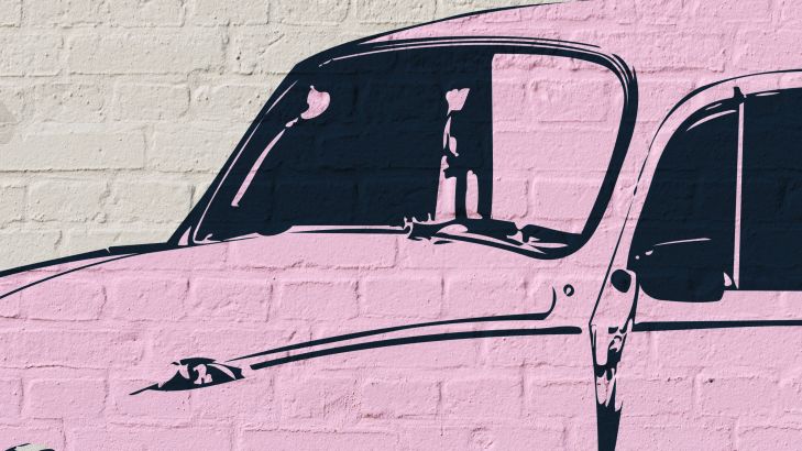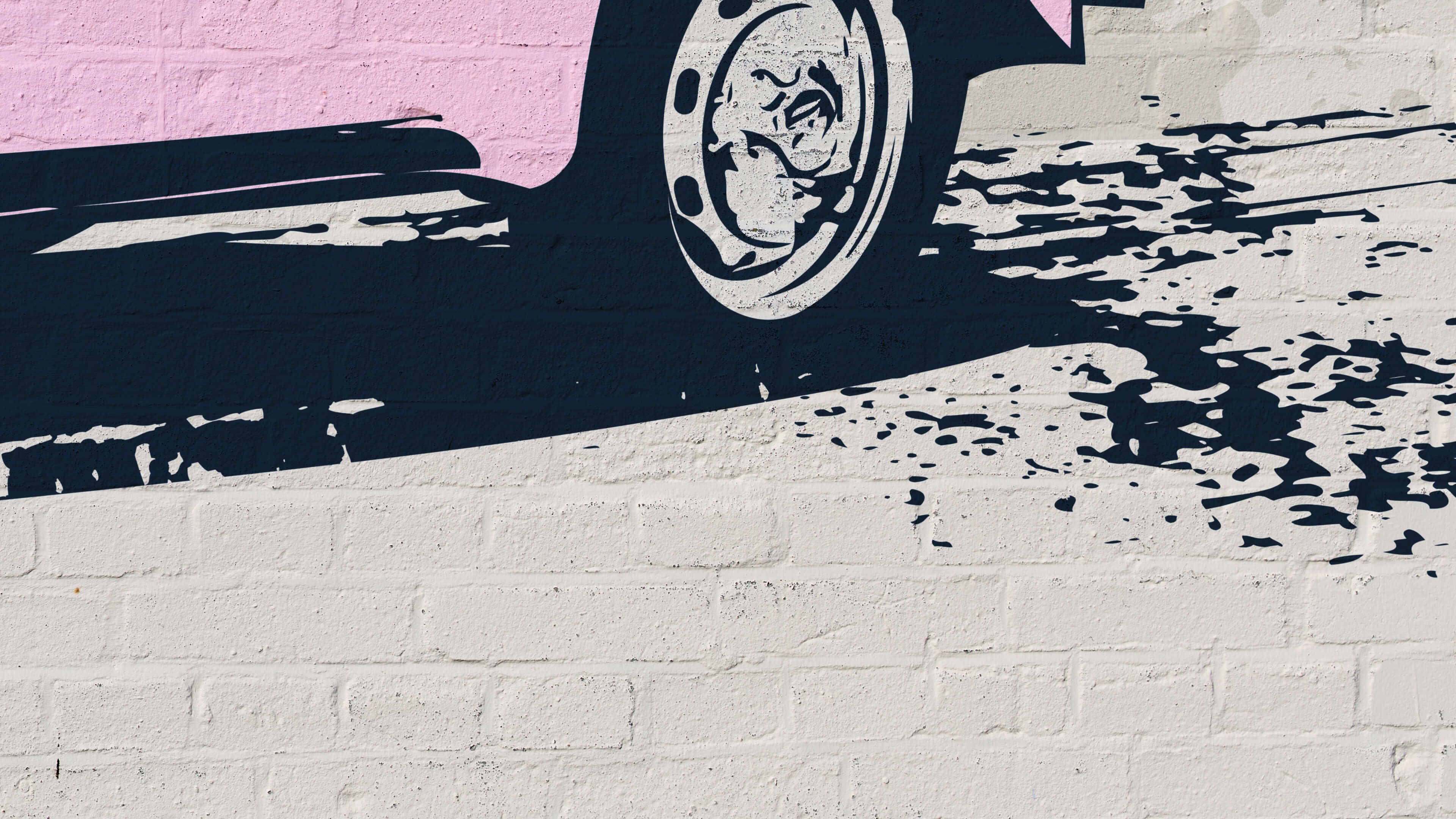 Graffiti Beetle in pink on a white wall. The pink colour makes the beetle stand out on the wall.