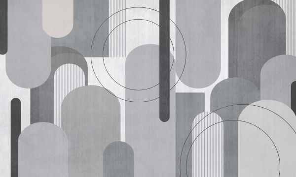The transitions from light to dark gray, punctuated by circular contours and straight lines, create a mysterious dimension. This design plays with perception and depth, resulting in an intriguing visual experience.