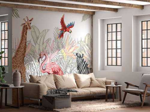 Hand-drawn animals in the jungle. Ideal wallpaper for the children's room.
