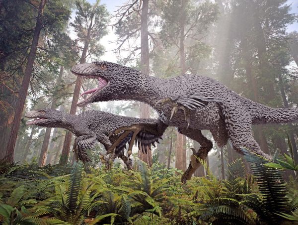 Hunting dinosaurs in the forest. This wallpaper completes any dinosaur room.