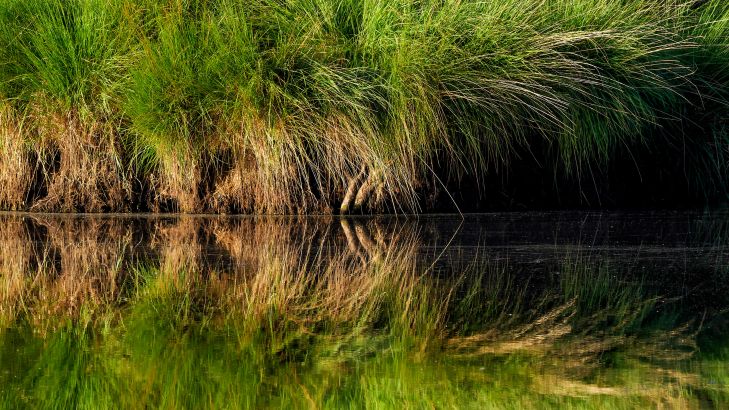 A beautiful island in a forest lake with the morning sun