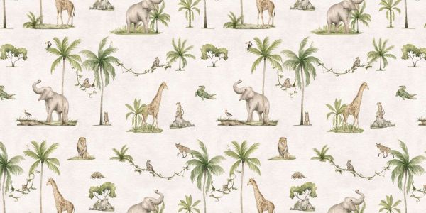 A cheerful jungle pattern with exotic animals such as elephants, giraffes, lions, and leopards, among palm trees and green foliage. The light background and detailed illustrations create a playful and airy atmosphere, ideal for adding an adventurous touch to any space.