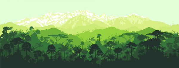 Green illustration with trees and plants. High snow-capped mountains can be seen in the background.