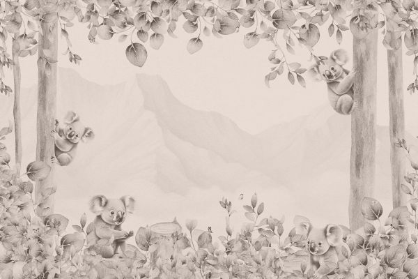 Cozy koalas clinging to eucalyptus trees, surrounded by blooming flora, all captured in soft pencil sketches that create a warm, inviting atmosphere.