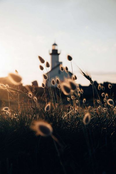 In terms of colors, the design is composed of warm gold tones, deep olive green, soft brown, and subtle white. The combination of sharpness in the grass and the blurred lighthouse in the background creates layers and a dreamy character. The sunlight reflection around the grass plumes gives an almost ethereal glow, making the whole scene particularly atmospheric and soft.