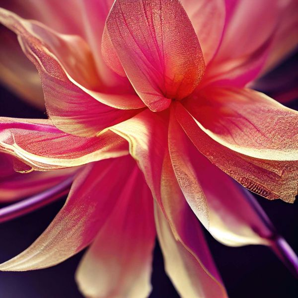 This design showcases a flower that appears to glow from within, with a radiant color gradient from fuchsia and crimson pink to fiery orange and golden accents. The petals are delicate in texture, with velvety details that capture light and emit a soft glow. The layered structure and flowing shapes give the whole a dynamic, almost dancing appearance, as if the flower is in motion — powerful yet elegant. This flower fits beautifully in an eclectic interior where bold colors and shapes come together, but also shines in a luxurious bohemian interior with rich fabrics, warm earth tones, and golden accents. Think of a space with dark wood, soft lighting, and expressive artworks — this flower forms a visual centerpiece full of character. The color scheme, composed of bright pink and orange tones with soft transitions to gold and ivory, brings warmth, energy, and sophistication. The petals fold around a mysterious center, creating a layered and intriguing whole. Ideal for a living room where you want to add a lively accent, a modern bedroom with a luxurious feel, or a creative workspace where inspiration is key. Also perfect for a boutique hotel or exclusive salon, where an image like this exudes elegance and expressiveness. The velvety bloom captures the moment when color and light meet — a flower like a flame.