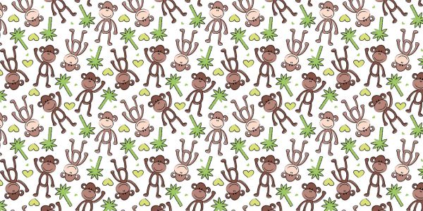 Wallpaper with a pattern of monkeys, palm trees and hearts on a white background