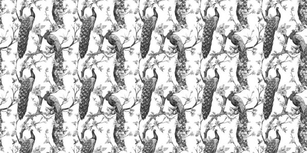 A stylish black and white design that captures the majesty of the peacock amidst a delicate floral background.