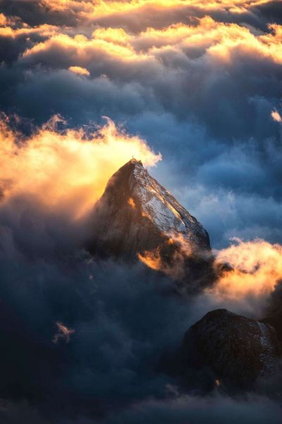A powerful mountain peak rises straight up from a deep blanket of dense clouds, where bright orange sunlight breaks through like flames. At the summit sits a small, visible cross, making this image not only visually impressive but also evoking a sense of silence, devotion, and grandeur. The combination of cool shadows in blue and gray with warm light accents creates a dramatic interplay of calm and intensity. The texture of the rock, lightly dusted with snow, emphasizes the raw beauty of nature. The sun's glow appears to rest like a crown on the mountain peak, giving the whole scene an almost spiritual aura. The dense cloud mass around suggests height, solitude, and freedom, creating an intimate atmosphere despite the grandeur of the landscape. This design fits perfectly in a modern, minimalist, or even spiritually inspired interior. In spaces with neutral walls, natural materials, and serene textures, this image will stand out as a visual focal point. Think of combinations with concrete look, wooden accents, wool-white linen, or copper-colored accessories. Ideally suited for spaces where you want to add depth, contemplation, and emotional depth – such as a reading corner, bedroom, or home office. This image also works exceptionally well in a meditation or quiet spot. Due to its vertical composition, it is also ideal for narrow walls or alcoves.