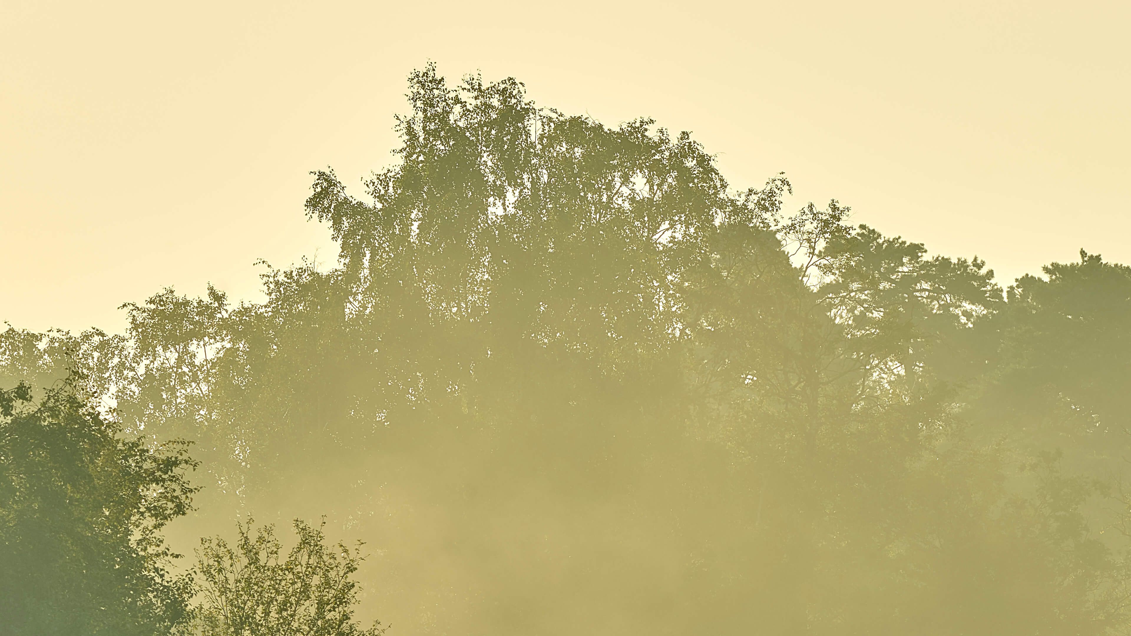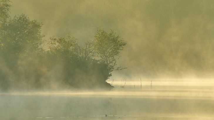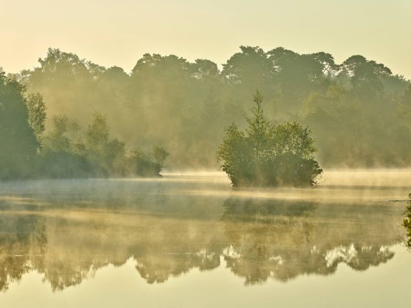 Nebula above a forest lake at sunrise