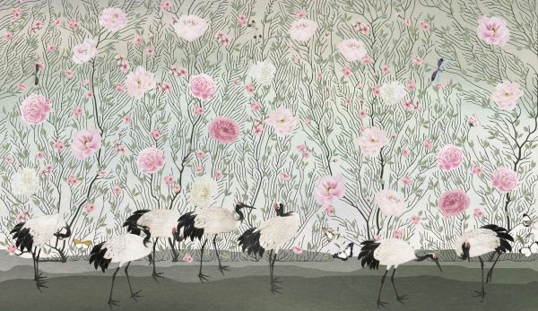 A graceful scene with stately cranes surrounded by delicate roses and blossoms. The subtle shades of pink and green create a serene and refined atmosphere, enhanced by the graceful details of flowers and leaves. Butterflies and dragonflies add a touch of elegance to the design.