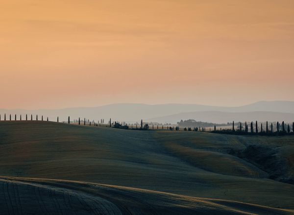 Orange glow during sunset over an Italian landscape. Combine this wallpaper in your home for even more atmosphere.