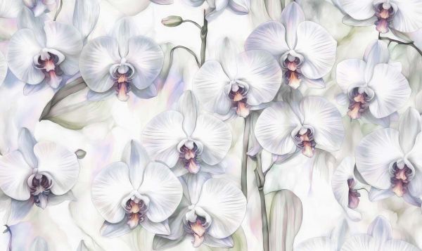 The beauty of the white orchids comes to life in this refined design, where realistic details and a subtle watercolor style come together. The graceful flowers are depicted in soft shades of white, cream, and pastel violet, with a touch of lilac and apricot at the heart of each orchid. The background is light and dreamy, with delicate green leaves framing the flowers and giving a fresh, natural look. This design fits perfectly in a romantic or classic interior style, where soft colors and elegant details take center stage. Imagine a bedroom with light-colored furniture, silk curtains, and subtle gold accents for a luxurious appearance. In a modern interior with minimalist furniture and a neutral color palette, the design adds a touch of refinement and tranquility. The soft, watercolor-like texture of the design makes it ideal for spaces where a serene and relaxing atmosphere is desired, such as a bedroom, wellness area, or stylish living room. Combine with light, natural materials like linen, wood, and marble to enhance the fresh and refined look. For a playful contrast, accessories in gold or soft pink can be added. With its dreamy appearance and luxurious feel, this design offers timeless elegance that transforms any space into an oasis of peace and beauty.