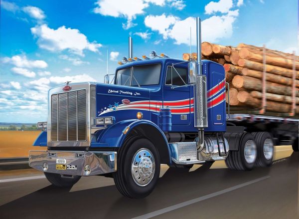 A powerful blue truck, loaded with logs, drives along a sunny highway. The sleek lines and shiny accents symbolize strength and reliability in a vast American landscape.