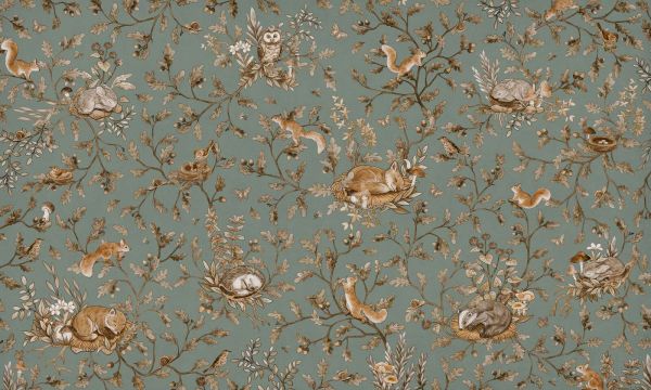 This design brings a fairytale forest landscape to life, where tranquility and nature come together on a soft sage green background. Delicate oak branches full of leaves, acorns, and flowers playfully weave through the image. Among the leaves, you can see rabbits snugly sleeping in their nests, squirrels frolicking through the branches, an owl keeping watch, and small birds sheltered in their nests. Everywhere among the leaves, you discover butterflies, mushrooms, snails, and blooming plants – as if you are walking through a peaceful forest. The combination of the serene sage green with warm brown and ochre tones creates a harmonious and cozy atmosphere. This makes the design perfect for a natural children's room or a soft and cozy baby interior, but also beautiful as an accent in a rural hallway or a cozy reading nook. The colors feel earthy and fresh at the same time, making them blend well with other natural materials such as wood, linen, and wool. The illustrations are refined and rich in detail, with a hand-drawn appearance reminiscent of classic picture books. The repetition of the branches provides rhythm, while the animals and flowers add a playful, lively character. The pattern remains airy and soft, despite the rich filling with animals and plants. Styling tip: combine this design with furniture in light wood or rattan, soft cushions in sand or mustard tones, and decorations made of felt or wool. Also beautiful with accessories in cream, copper, or terracotta. This creates a warm, natural space where both children and adults can relax.