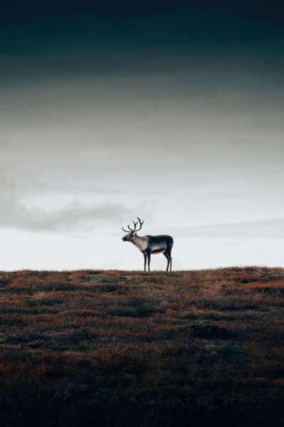 A solitary reindeer stands powerfully in an expansive, brown-orange heath landscape under a cloudy sky. The composition breathes tranquility, openness, and natural grandeur, with a contrasting interplay between the warm earth surface and the cool, pale sky.