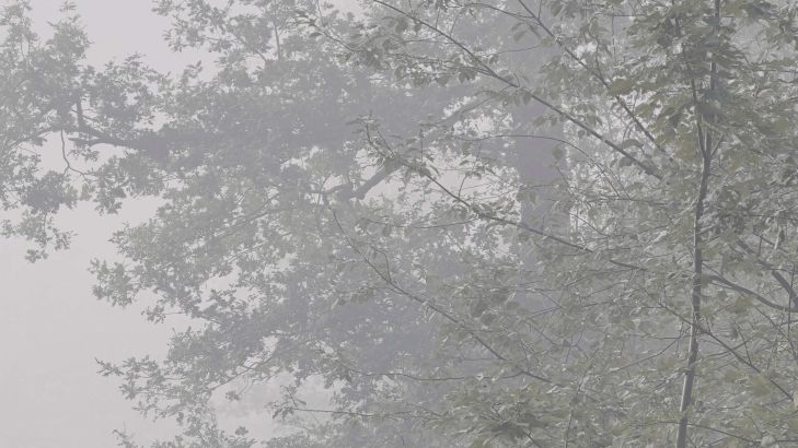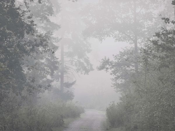 A narrow road through a misty forest full of beautiful trees. The forest looks mysterious because of the mist.
