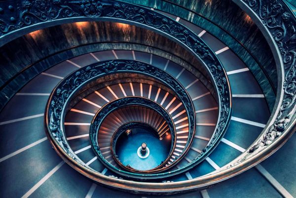 This fascinating design immerses the space in a visual whirlpool of elegance and symmetry. The spiral shape, inspired by a monumental spiral staircase, immediately captures attention and conveys a strong sense of movement and depth. The color scheme is particularly harmonious: cool tones such as midnight blue and steel gray are warmed by accents of copper and soft amber light, giving the whole a cozy, almost cinematic look. The richly decorated balustrade with baroque ornaments adds a classic touch, while the geometric repetition of lines creates a modern, almost futuristic rhythm. This combination makes the design extremely suitable for both modern interiors and classic-eclectic living styles, where it can serve as a powerful visual focal point. In a modern setting, this design pairs excellently with minimalist furniture in black, brass, or dark wood, and accessories in smoked glass or leather. For a more classic look, consider velvet fabrics, vintage lighting, and golden accents that enhance the copper details. Ideal for use in spaces where impact is desired: a stylish living room, an artistic home library, an inspiring home office, or even a luxurious hallway. The spiral effect invites contemplation and makes every space feel larger and more dynamic. The pattern exudes timeless elegance and effortlessly combines classic romance with contemporary sophistication, resulting in a mesmerizing effect.