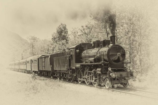 Oude stoomtrein op fotobehang in vintage look. Prachtig behang op dik vliesbehang wat zorgt voor een mooie luxe uitstraling