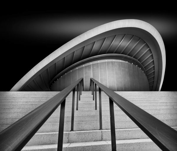 Sunrise wallpaper. A black and white photo of a staircase with an asymmetrical building above it.