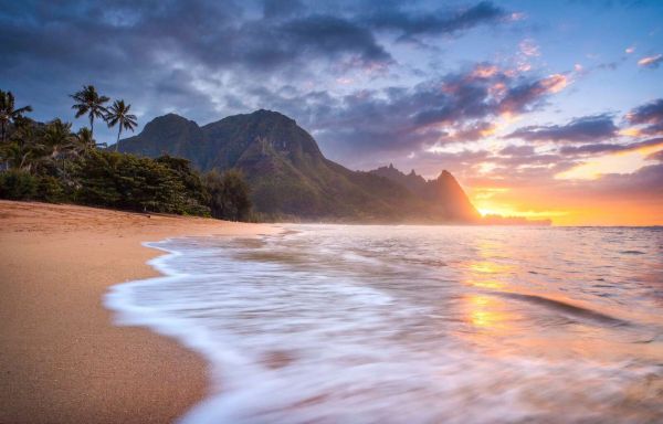 A colorful sunset reflects in the waves along a tropical beach, surrounded by palm trees and lush mountains. The warm light and calm waves create a dreamy and relaxed atmosphere.