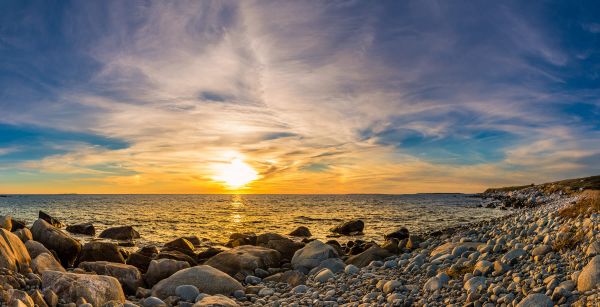 A Beautiful coastal scene of a sunset along the Atlantic Ocean at dusk.