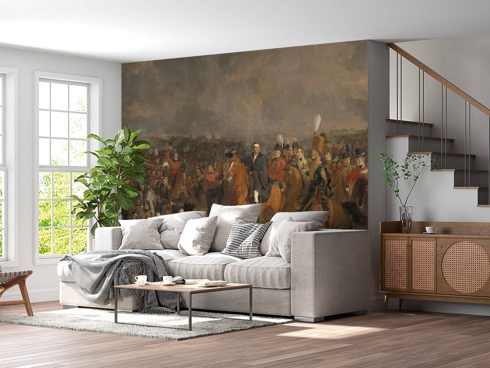 The Battle of Waterloo on wallpaper. It was painted by Jan Willem Pieneman, 1824. We see the Duke of Wellington, who is told that the Prussian troops are coming to the rescue. On the left is the Dutch crown prince, William II, wounded on a stretcher.