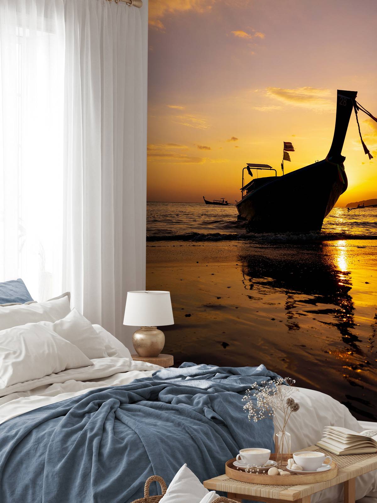 Traditional long-tailed boat on the beach in Thailand at sunset