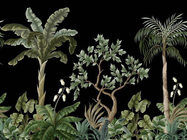 Wallpaper of a jungle landscape with palm trees. Combine this wallpaper in the bedroom, for example.