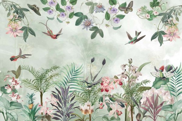 This design captures the essence of a tropical paradise, where natural beauty and serenity come together. Exotic flowers such as orchids and passion fruits bloom amid lush palm trees and various green leaves. Hummingbirds float gracefully through the air, surrounded by subtle butterflies that dance delicately among the flowers. The color scheme, consisting of soft pastel shades and lively accents, emphasizes both a fresh and relaxed atmosphere.