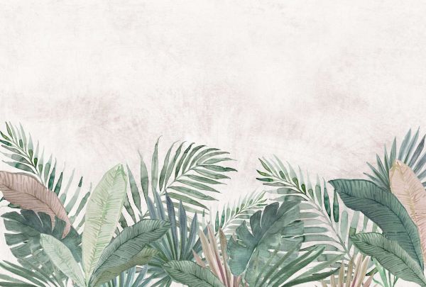 A oasis of tropical freshness unfolds in this soft and inviting design. All kinds of tropical leaf species - from large banana leaves and elegant palm fronds to Monstera and dracaena - come together in a harmonious composition at the bottom of a light background. The soft watercolor technique provides natural color transitions between shades such as jade green, olive green, soft mint, moss green, and powder pink. The background has a subtle texture reminiscent of weathered linen or lime paint, giving the whole a rustic, natural look. This design fits perfectly with a botanical or bohemian living style, where natural elements and a playful color palette come together. Think of a combination with rattan or bamboo furniture, light fabrics, and natural accessories such as wooden side tables, pottery, and hand-woven carpets. It also forms a surprisingly fresh accent in a modern interior - for example in a space with white walls, clean lines, and plants in designer pots. Ideally suited for light living spaces such as a living room with plenty of daylight, a children's room, or a tropical-inspired bathroom. By placing the canopy of leaves at the bottom, the rest of the space remains visually calm while still adding a distinct character. Combine this design with accessories in terracotta, linen curtains in sand colors, or furniture with a light wood finish. Want to evoke a slightly more tropical atmosphere? Then add accents in ochre yellow, coral red, or turquoise. The versatility of the design makes it easy to adapt to your personal style.