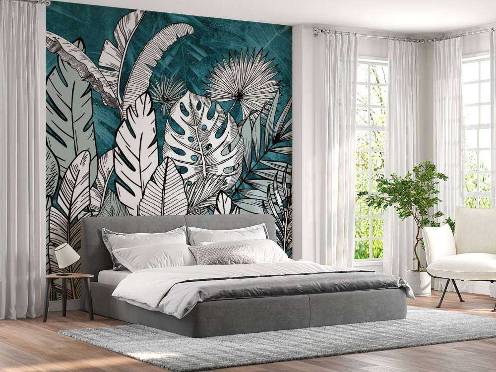 Drawn tropical leaves on a petrol-coloured concrete background.