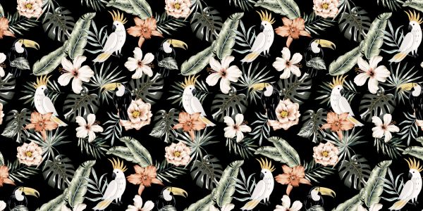 A tropical wallpaper with a parrot, toucan, hibiscus, orchids and palm leaves with a black background.