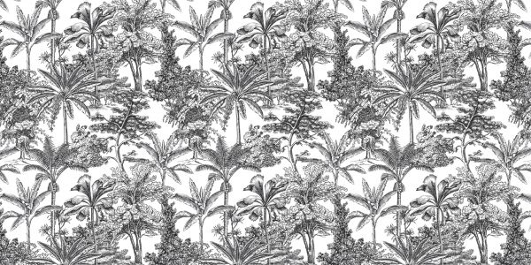 Drawn tropical trees in black and white, including palm and banana trees.