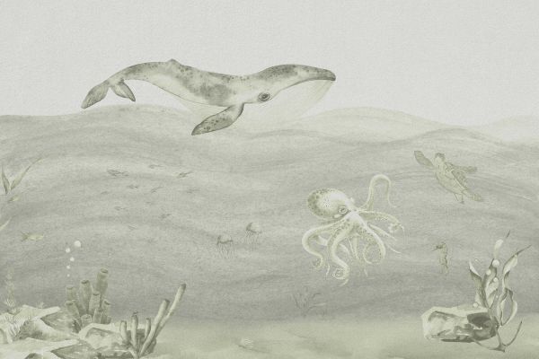 Underwater world with a whale and octopus in green.