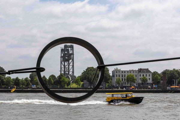 A playful and dynamic cityscape in which the iconic Hef Bridge is perfectly framed by a circular metal element. In the foreground, a striking yellow water bus sails across the Maas, adding movement and energy to the composition. The clear sky and the greenery on the other side provide a fresh and balanced appearance.