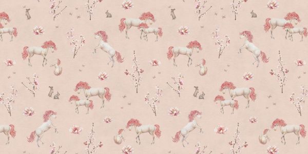 An enchanting pattern with graceful unicorns, blooming branches, and soft flowers. The romantic pink hues and delicate illustrations create a magical, dreamy atmosphere, perfect for adding a whimsical accent to any space.