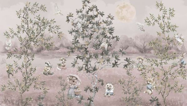 The image not only creates atmosphere but also evokes a sense of nostalgia and tranquility. The surroundings with graceful trees, floating butterflies, a full moon, and a babbling brook invite imaginative stories and play. With its rich detail, children (and adults) continue to discover new elements.