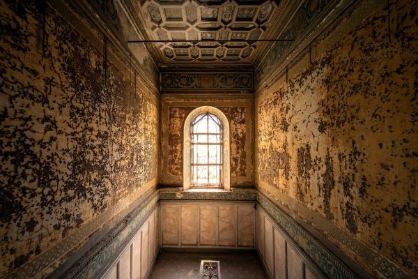 A atmospheric design with weathered gold tones, peeling paint, and historical details. The combination of warm yellow, brown, and old blue gives a nostalgic appearance, as if time has left its marks. This design evokes the grandeur of a bygone era and brings a unique vintage charm to any space.