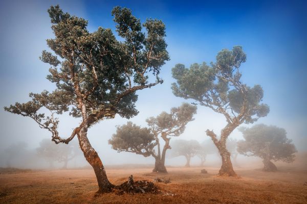 Trees in a dry area. You can see dust clouds from the sand in this area.