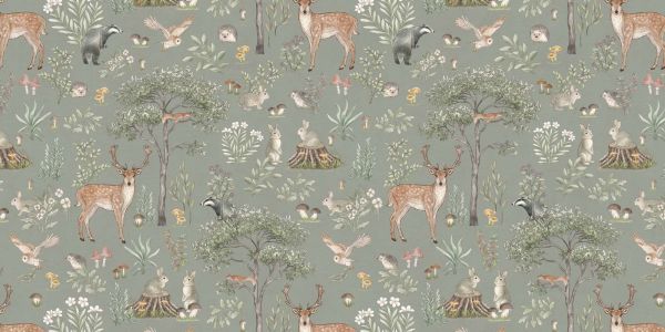A magical forest pattern with detailed animals such as deer, rabbits, badgers, and owls, framed by trees, bushes, and mushrooms. The vintage background color creates a fairy-tale, serene atmosphere, ideal for adding an enchanting accent to any space.