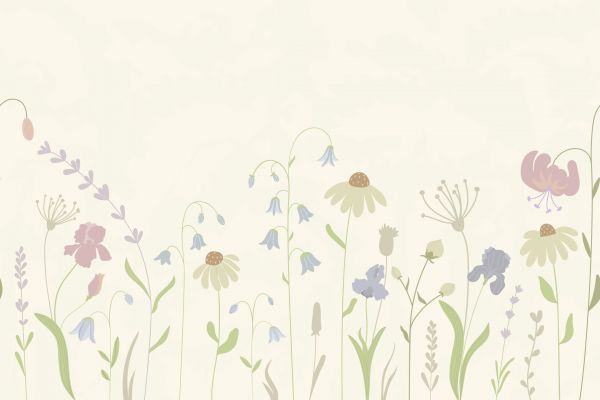 High flower field with different flowers. Colour: Beige with various colours such as old pink, green and lilac.