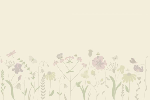 Field of flowers with different flowers and various insects such as butterflies and bees. Colour: Beige with old pink