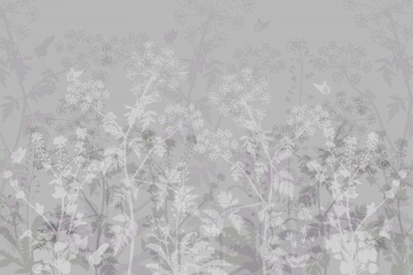 A soft composition of silhouettes of flowers and leaves, refined in layers of transparent pastel colors. Butterflies and other delicate details add a touch of playfulness to the serene and organic atmosphere.