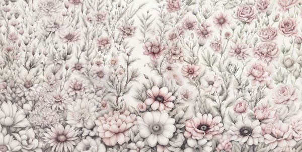 A dreamy field of blooming flowers in soft pastel shades of pink and cream, framed by delicate gray-green leaves. The refined details and subtle color transitions give the design a romantic, vintage look with a touch of nostalgia. Perfect for a serene and elegant atmosphere.